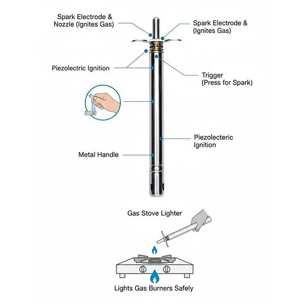 The long handle keeps your hand at a safe distance from the flame while lighting the stove.